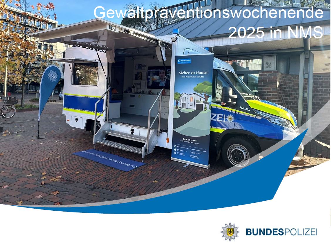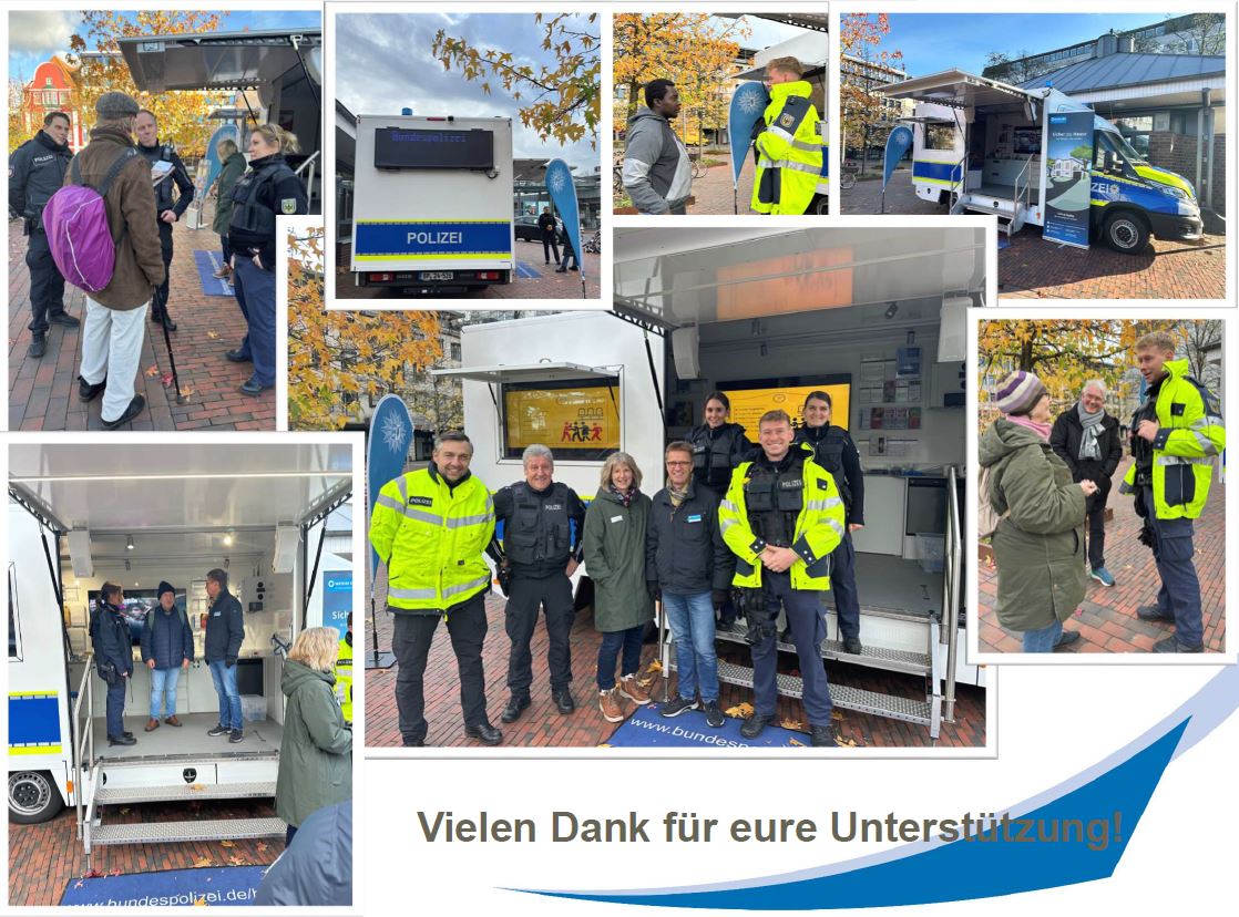 Gewaltpräventionswochenende 2025 in Neumünster auf dem Bahnhofsvorplatz (Konrad-Adenauer-Platz) bei bestem Schleswig-Holsteinischen Novemberwetter mit der Bundespolizei (Melissa Münzel und Johanna Becker) und dem AS Neumünster-Team vom WEISSEN RING (Ann-Cathrin, Gerald, Iris, Jürgen, Manuela und Michael). Herzlichen Dank für euren Einsatz!